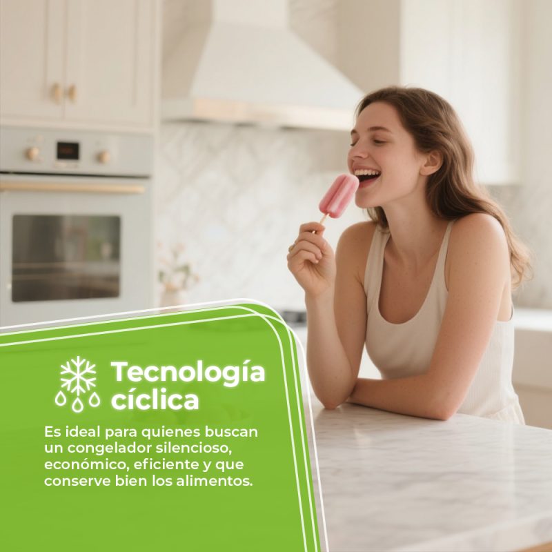 Congelador de tecnología cíclica, con motor universal y gas R600a. Eficiencia energética E y nivel sonoro máximo de 39 dB.