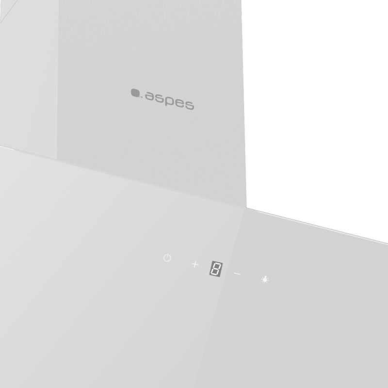 Campana Inclinada Aspes, Clase A++ Dimensiones: 108,8cm 89,5cm 30,9cm. Color Cristal blanco, Control Táctil Motor Inverter. Potencia de aspiración 370 m3/h, 59 dB.