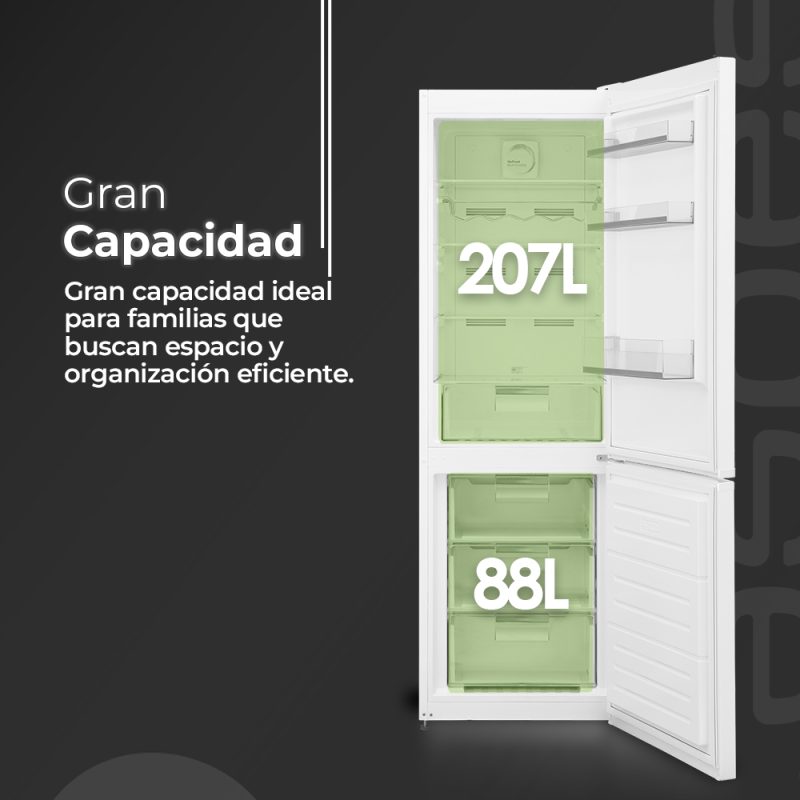 Capacidad total de 295 Litros, con congelador 4 estrellas y múltiples compartimentos para un óptimo almacenaje.