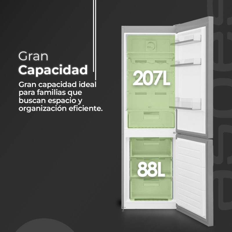 Capacidad total de 295 Litros, con congelador 4 estrellas y múltiples compartimentos para un óptimo almacenaje.