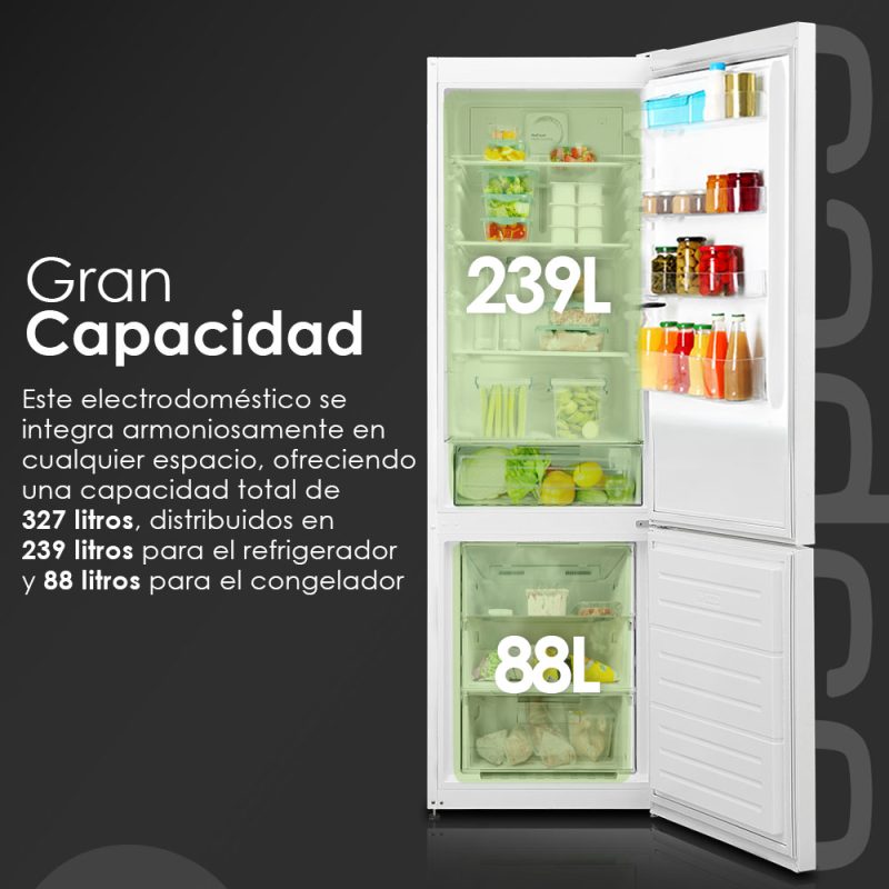 Capacidad total de 327 Litros, con congelador 4 estrellas y múltiples compartimentos para un óptimo almacenaje.
