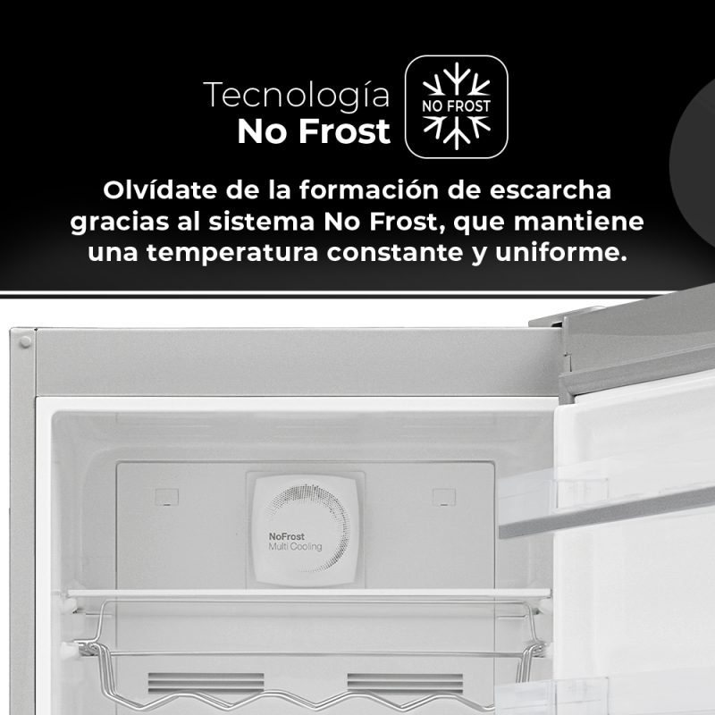 – La tecnología No Frost garantiza una óptima conservación de los alimentos y evita la formación de hielo y escarcha en el frigorífico. Junto con la ventilación Multi Air Flow, consiguen una distribución uniforme en toda la cavidad y un enfriamiento más rápido.