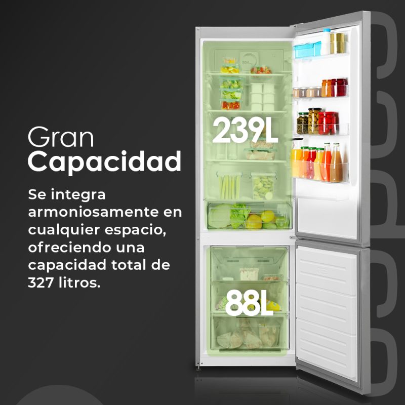 Capacidad total de 327 Litros, con congelador 4 estrellas y múltiples compartimentos para un óptimo almacenaje.