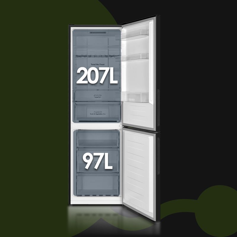 Capacidad total de 304 Litros, con congelador 4 estrellas y múltiples compartimentos para un óptimo almacenaje.