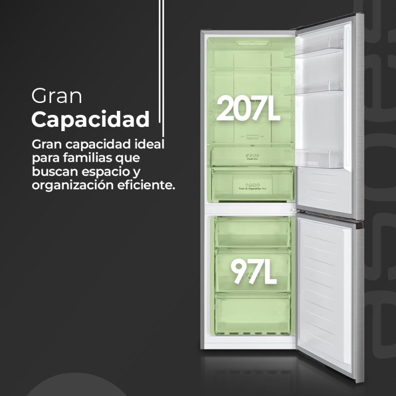 Capacidad total de 304 Litros, con congelador 4 estrellas y múltiples compartimentos para un óptimo almacenaje.