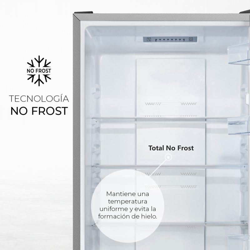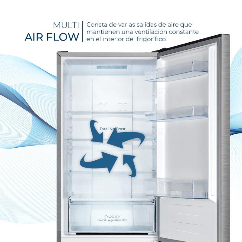 – La tecnología No Frost garantiza una óptima conservación de los alimentos y evita la formación de hielo y escarcha en el frigorífico. Junto con la ventilación Multi Air Flow, consiguen una distribución uniforme en toda la cavidad y un enfriamiento más rápido.