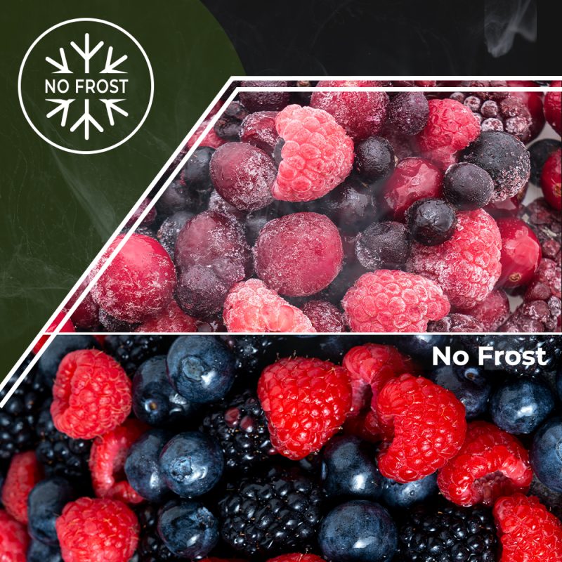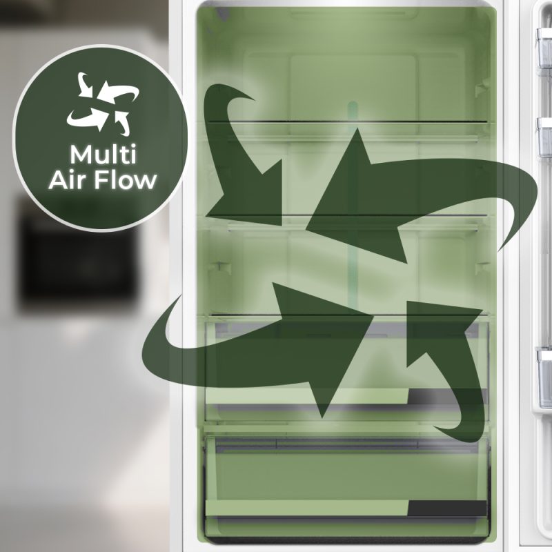 – La tecnología No Frost garantiza una óptima conservación de los alimentos y evita la formación de hielo y escarcha en el frigorífico. Junto con la ventilación Multi Air Flow, consiguen una distribución uniforme en toda la cavidad y un enfriamiento más rápido.