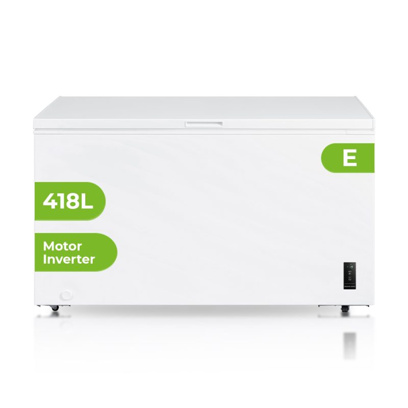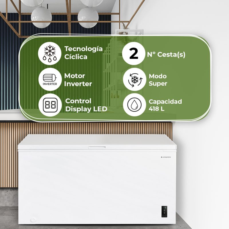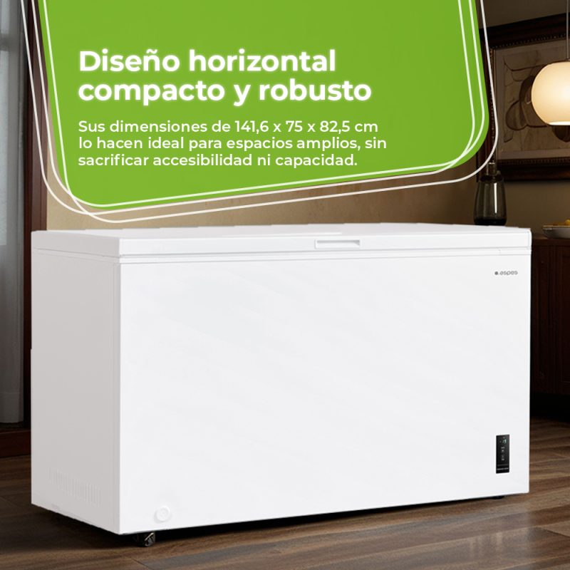 Congelador horizontal Aspes, Dual Cooling. Capacidad 418 L, Clase E. Dimensiones: 82,5cm 141,6cm 75cm. Color Blanco, Control con Display. Motor Inverter. 2 Cestas.