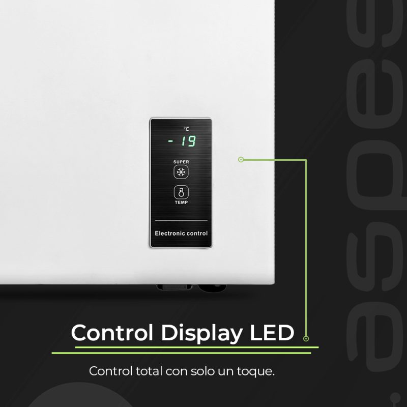 Estética blanca con 1 puerta de abertura tipo uñero. Sistema de control electrónico con Display LED, descongelación manual y funciones con las que sacar el mayor rendimiento al congelador.