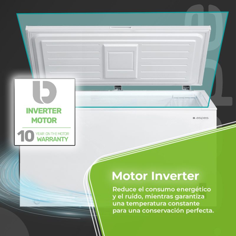 – El motor Inverter optimiza el rendimiento del congelador en base a las necesidades de cada momento, trabaja a baja velocidad evitando sobrecargas y favoreciendo la durabilidad y eciencia energética del producto. Para garantizar la calidad y funcionalidad de este motor, ofrecemos hasta 10 años de garantía en este.
