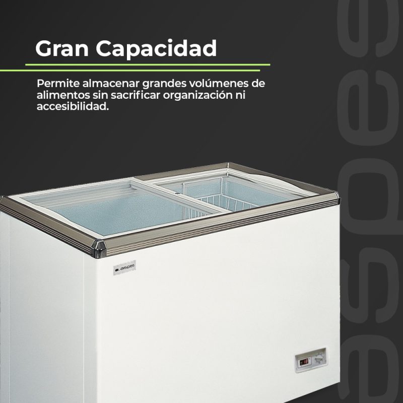 Estética blanca con 2 puertas deslizantes de cristal de abertura con tirador. Sistema de control electrónico con Display LED, descongelación manual y funciones con las que sacar el mayor rendimiento al congelador.