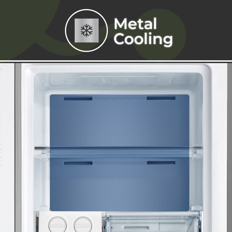– El revestimiento interior Metal Cooling mantiene una temperatura óptima de congelación y consigue un enfriamiento más duradero. Gracias a la buena conductividad térmica del metal, la lámina conserva el frío durante más tiempo, incluso al abrir y cerrar la puerta constantemente, ya que ayuda a restablecer el posible aumento de grados.