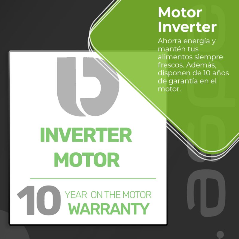 – El motor Inverter optimiza el rendimiento del frigorífico en base a las necesidades de cada momento, trabaja a baja velocidad evitando sobrecargas y favoreciendo la durabilidad y efiencia energética del producto. Para garantizar la calidad y funcionalidad de este motor, ofrecemos hasta 10 años de garantía en este.