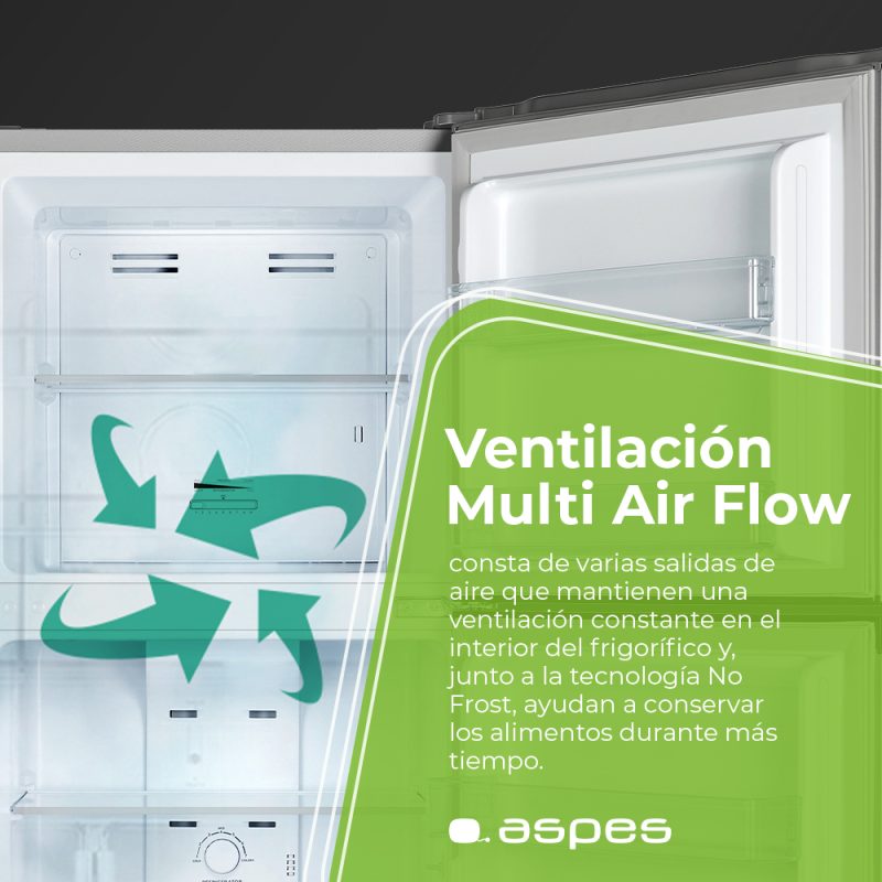 – La tecnología No Frost garantiza una óptima conservación de los alimentos y evita la formación de hielo y escarcha en el frigorífico. Junto con la ventilación Multi Air Flow, consiguen una distribución uniforme en toda la cavidad y un enfriamiento más rápido.