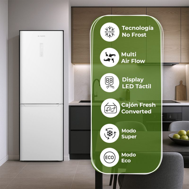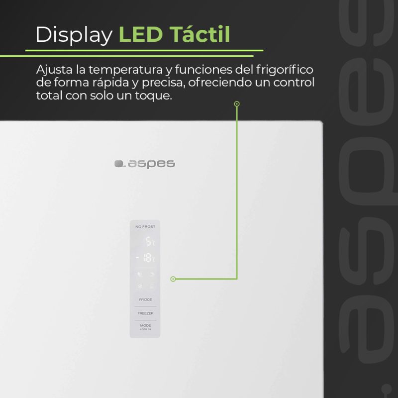 Frigorífico Combi Aspes, No Frost. Clase E. Dimensiones: 184cm 60cm 68,5cm. Color Cristal blanco, Control con Display táctil.