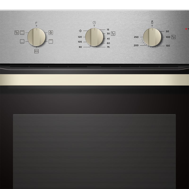 Estética Inox con puerta de doble cristal. Dispone de cavidad en relieve para colocar las bandejas e iluminación interior. Panel de control manual y mandos estándar, con termostato mecánico y temporizador mecánico. Ofrece 5 programas de cocción y diversas funciones para obtener el mayor rendimiento y facilitar el proceso de cocción.