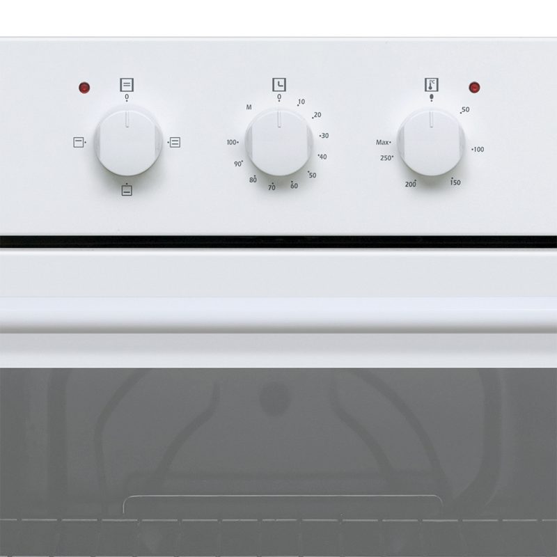 Estética blanca con puerta de doble cristal. Dispone de cavidad en relieve para colocar las bandejas e iluminación interior. Panel de control manual y mandos estándar, con termostato mecánico y temporizador mecánico. Ofrece 3 programas de cocción y diversas funciones para obtener el mayor rendimiento y facilitar el proceso de cocción.