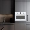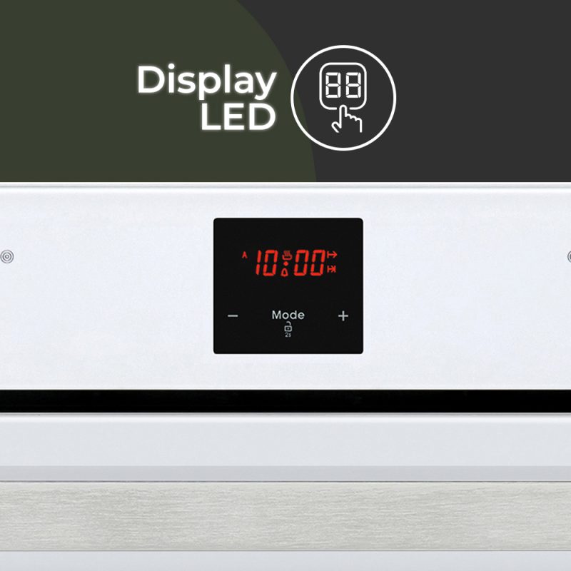 Estética de cristal blanco con puerta de doble cristal. Dispone de soporte metálico para las bandejas e iluminación interior. Panel de control electrónico con Display LED y mandos estándar, con termostato . Ofrece 9 programas de cocción y diversas funciones para obtener el mayor rendimiento y facilitar el proceso de cocción.