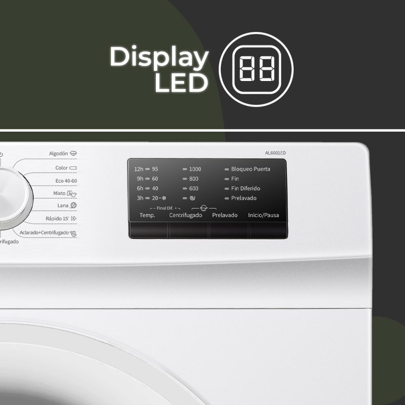 Estética blanca con puerta XXL blanco, tambor de acero inoxidable con superficie diamante. Sistema de control electrónico con Display LED con 15 programas de lavado y funciones para garantizar el mejor resultado y cuidado en tu colada.