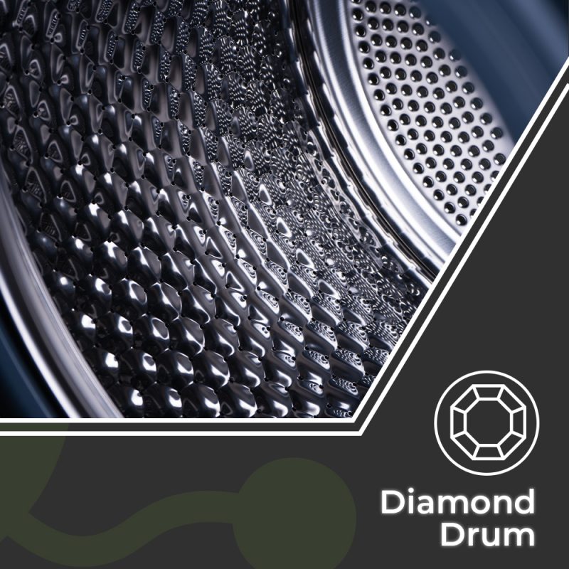 – El tambor con superficie diamante proporciona una mayor protección y delicadeza en cada lavado. Al disponer de menos orificios y de pequeños relieves se evita el desgaste o posibles enganches en las prendas, prolongando su vida útil.