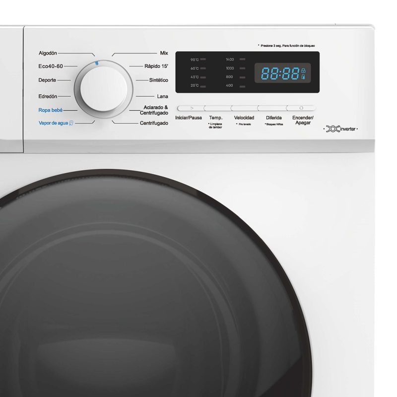 Estética blanca con puerta XXL oscura, tambor de acero inoxidable con superficie diamante. Sistema de control electrónico con Display LED con 12 programas de lavado y funciones para garantizar el mejor resultado y cuidado en tu colada.
