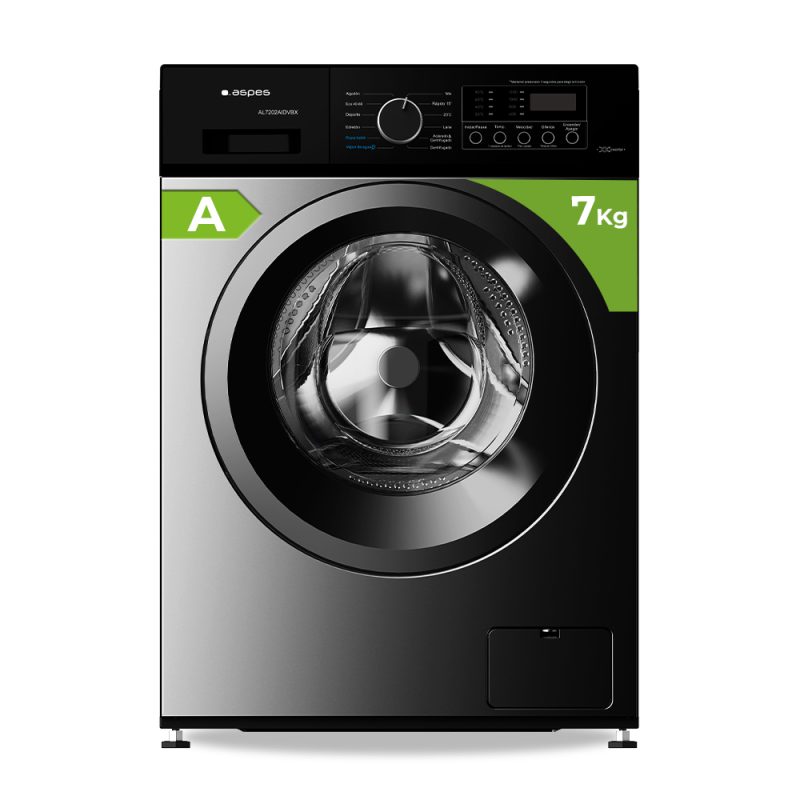 Lavadora Aspes,Capacidad 7kg 1200rpm, Clase A. Dimensiones: 85cm 59,5cm 44cm. Color Dark Inox, Control con Display. Motor Inverter. Programas: Vapor.