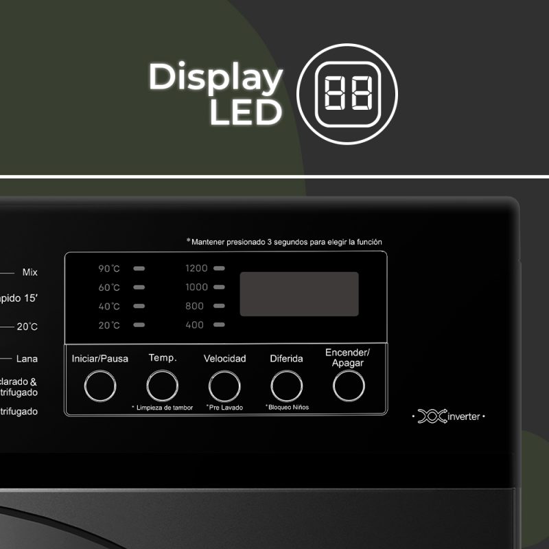 Estética Dark Inox con puerta XXL oscuro, tambor de acero inoxidable. Sistema de control electrónico con Display LED con 12 programas de lavado y funciones para garantizar el mejor resultado y cuidado en tu colada.