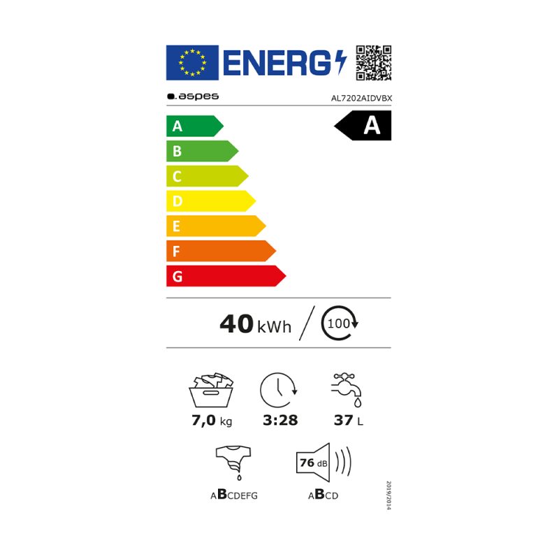 Lavadora con capacidad de carga 7 kg y una velocidad máxima de centrifugado de 1200 rpm. Motor Inverter con eficiencia energética A y nivel sonoro máximo de 76 dB.