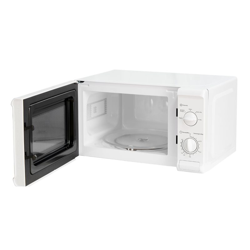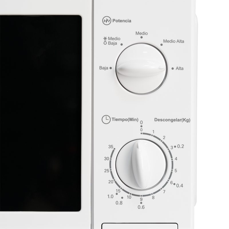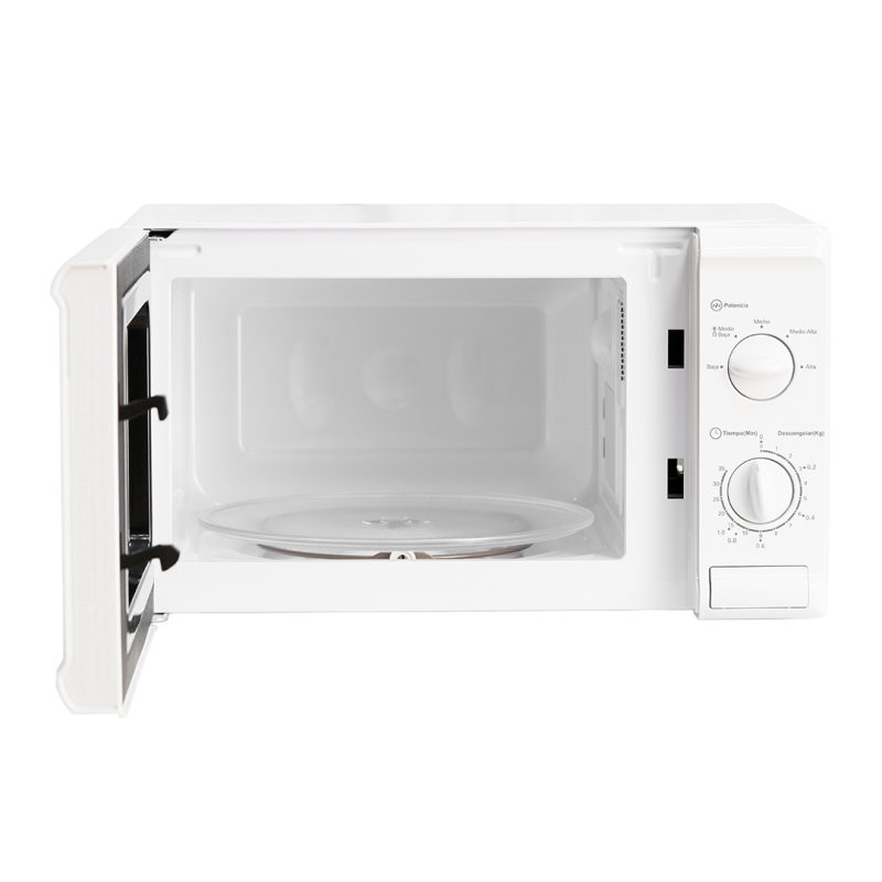 Estética blanca con puerta blanca y abertura con botón. Cavidad esmaltada en blanco con iluminación LED y plato giratorio de cristal. Sistema de control manual y temporizador mecánico. Ofrece 5 niveles de potencia y distintas funciones para obtener el mayor rendimiento y facilitar el proceso de cocción.
