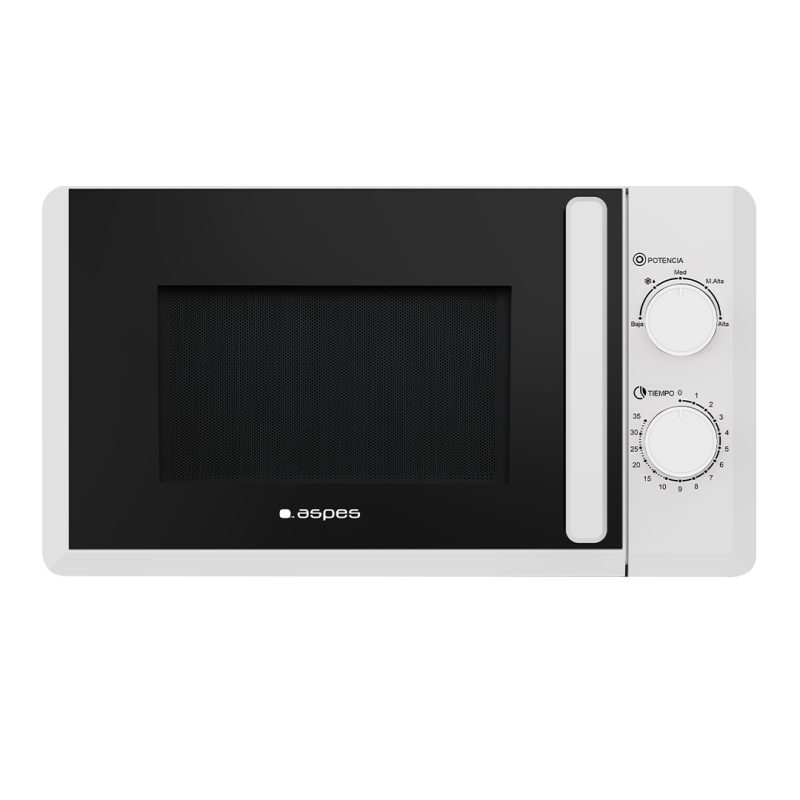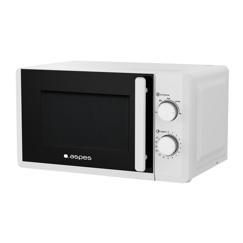 Estética blanca con puerta blanca y abertura con tirador. Cavidad esmaltada en blanco con iluminación LED y base cerámica, sin plato de cristal. Sistema de control manual y temporizador mecánico. Ofrece 5 niveles de potencia y distintas funciones para obtener el mayor rendimiento y facilitar el proceso de cocción.