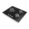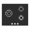 Placa preparada para gas butano con potencia total de 6050 W. Incluye Kit de conversión a gas ciudad. Cuenta con 3 quemadores de distinto tamaño, uno de ellos es quemador WOK de triple llama.