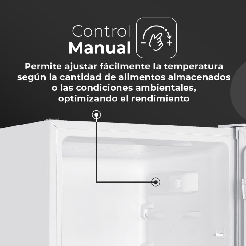 Estética blanca con 1 puerta reversible de abertura tipo uñero. Iluminación interior LED. Sistema de control manual y funciones con las que sacar el mayor rendimiento al refrigerador.
