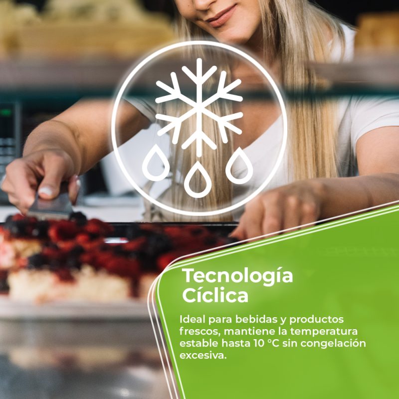 Refrigerador de tecnología cíclica, con motor universal y gas R600a. Eficiencia energética D y nivel sonoro máximo de 55 dB.
