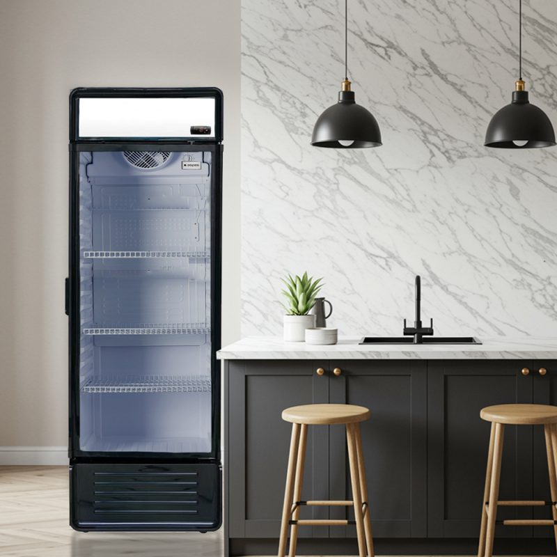 Estética negra con 1 puerta de cristal de abertura tipo uñero. Iluminación interior LED. Sistema de control electrónico con Display LED, descongelación automática y funciones con las que sacar el mayor rendimiento al frigorífico.