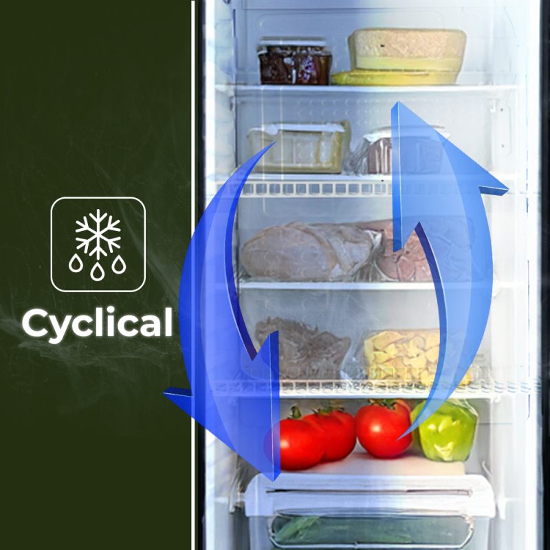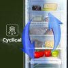 Refrigerador de tecnología cíclica, con motor universal y gas R600a. Eficiencia energética D y nivel sonoro máximo de 55 dB.