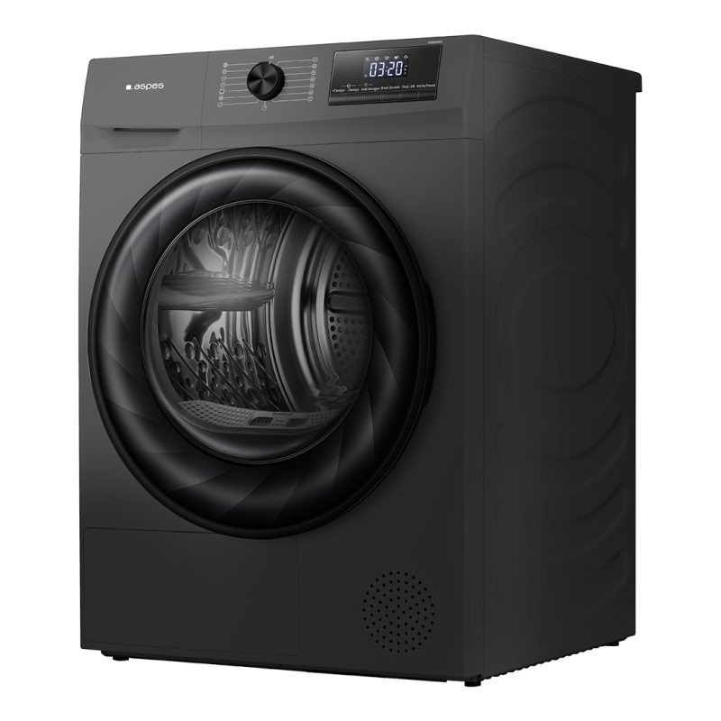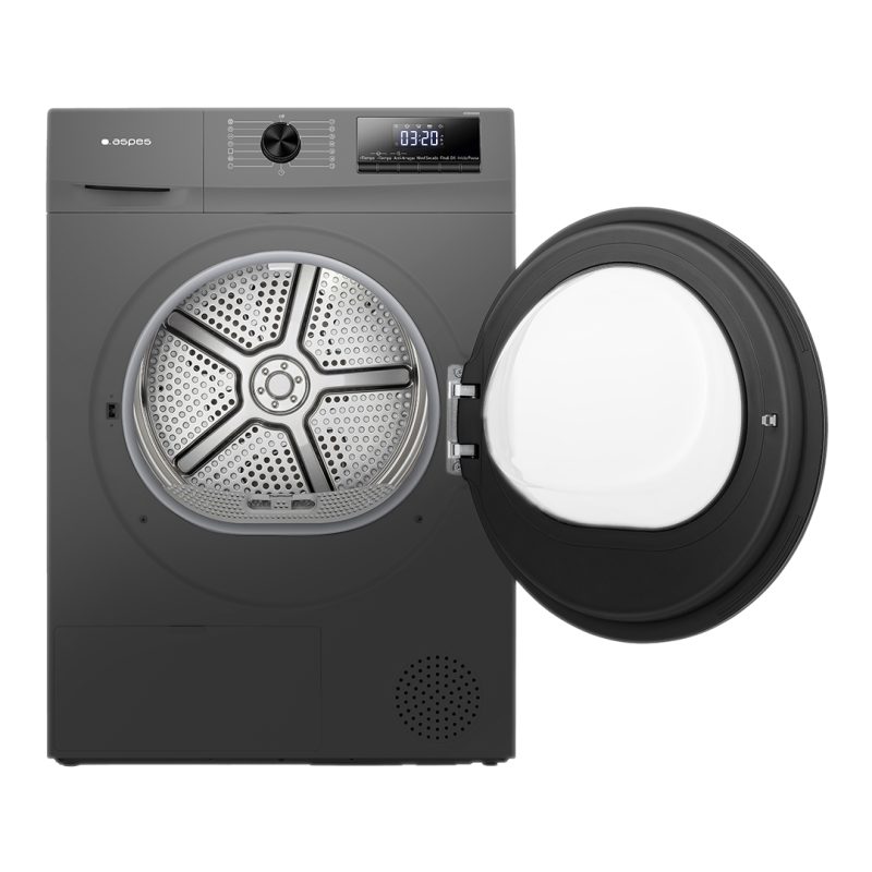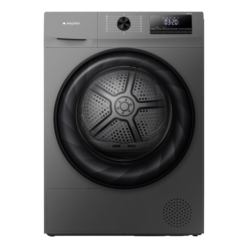 Secadora Bomba calor Aspes, Capacidad 8kg Clase D. Dimensiones: 84,5cm 59,5cm 58cm Color Inox, Control Display. Programas: Antialérgico Antiarrugas.
