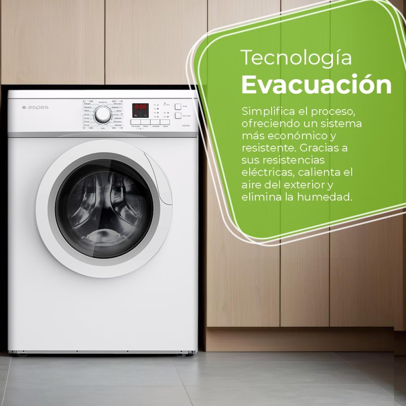 – Las secadoras de evacuación resultan más duraderas y económicas gracias a su sencilla tecnología. La corriente de aire caliente se genera mediante resistencias eléctricas y la humedad es expulsada al exterior a través de un tubo, por lo que requieren de instalación.