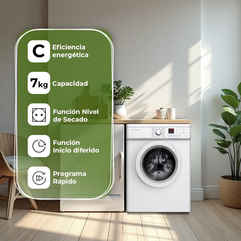 Estética blanca con puerta transparente, tambor galvanizado. Sistema de control electrónico con Display LED con 16 programas y funciones para garantizar el mejor resultado y cuidado en tu colada.
