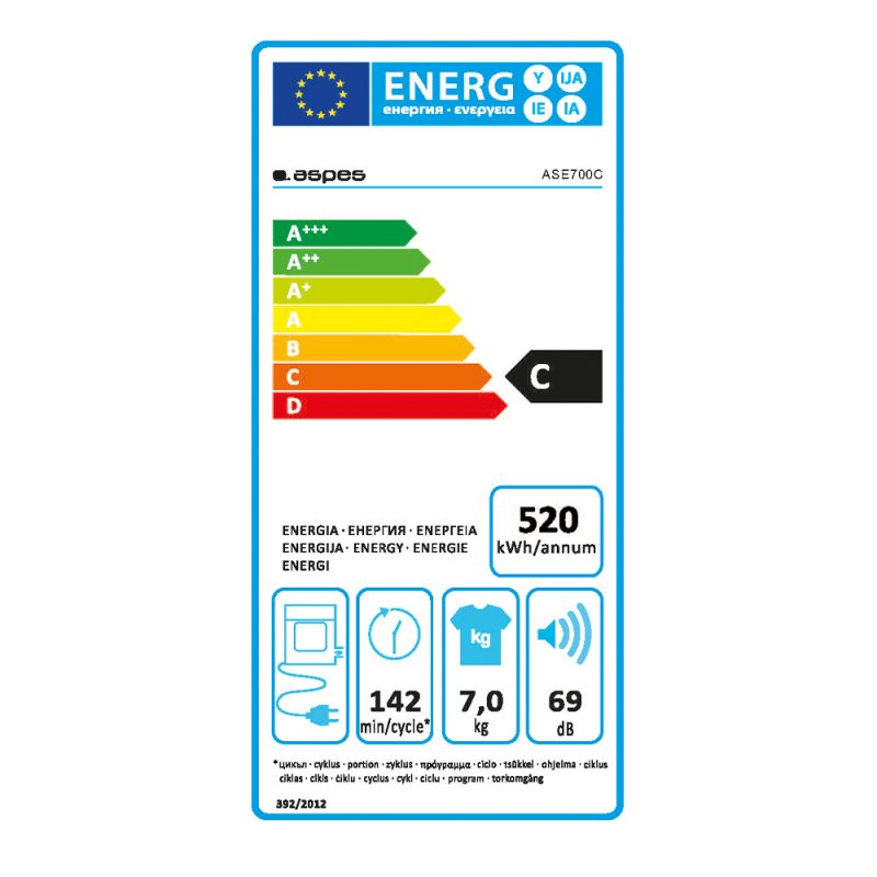 Secadora de evacuación con capacidad de carga 7 kg. Motor universal con eficiencia energética C y nivel sonoro máximo de 69 dB.