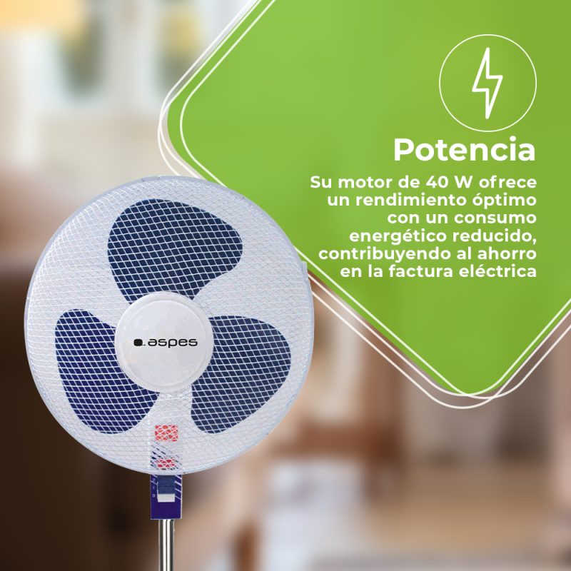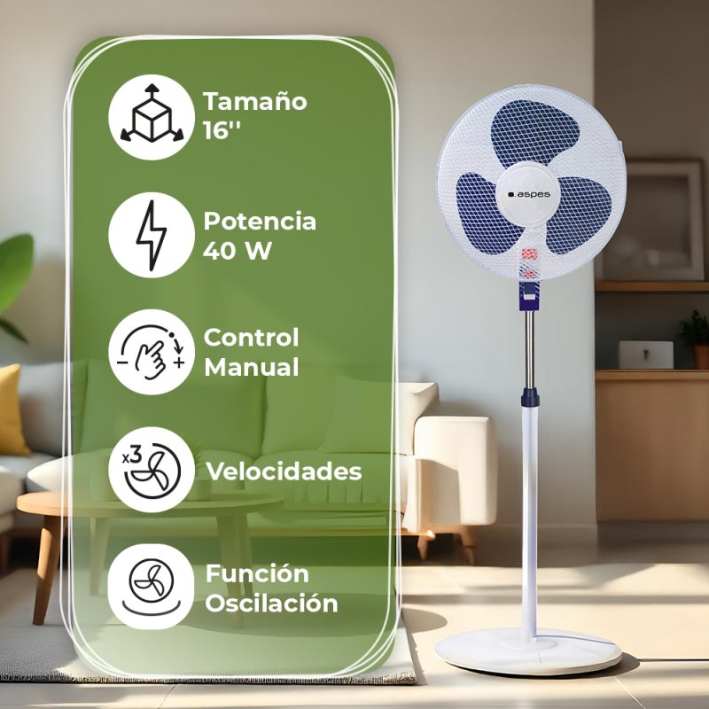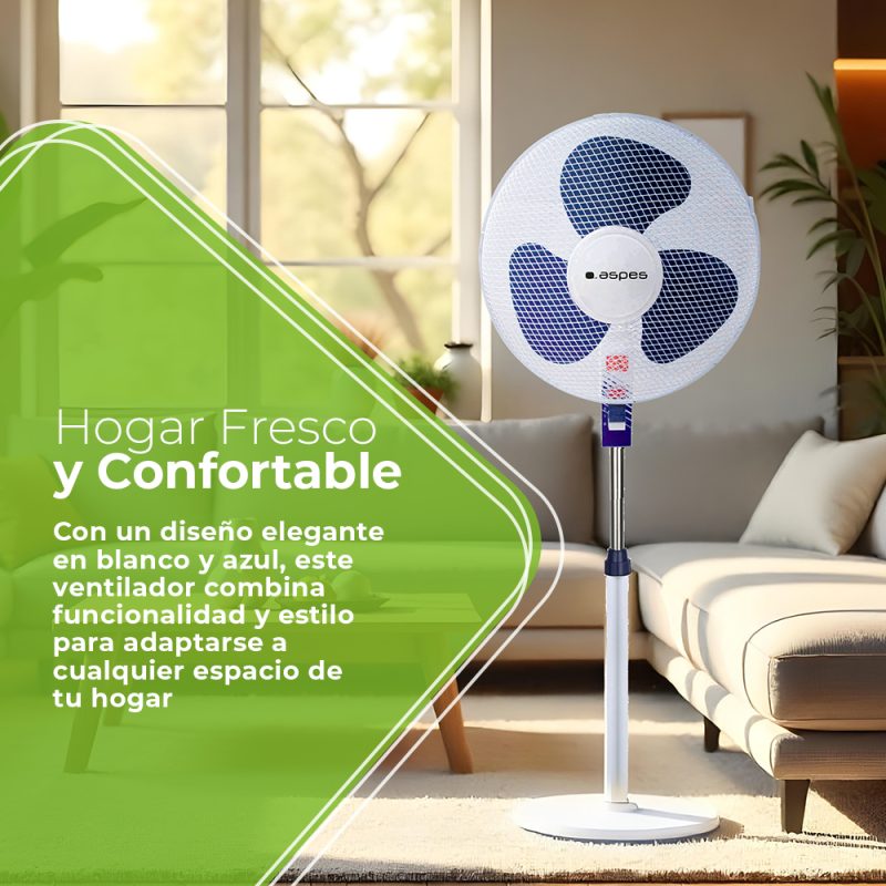“Ventilador Pie Aspes 16″” 40W Blanco y azul Manual 3V Oscilación”